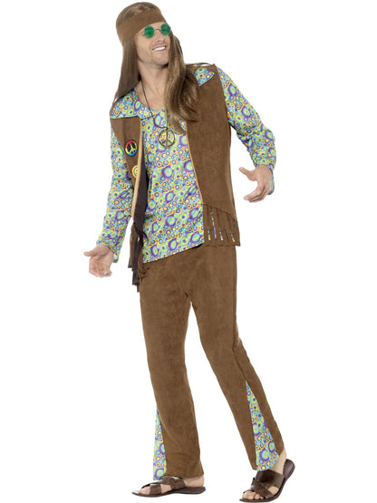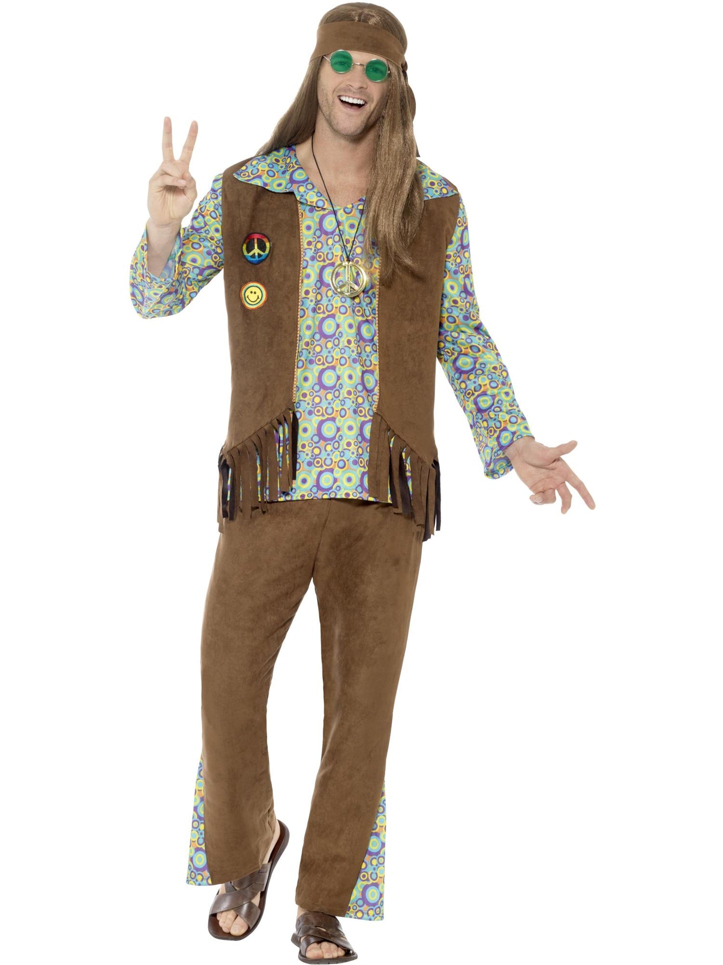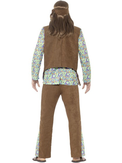 60s Hippie Costume, Multi-Coloured, with Trousers, Top, Waistcoat, Medallion & Headband.