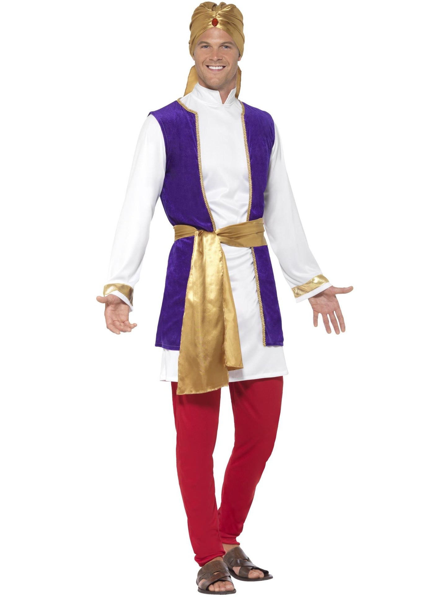 The Arabian Prince Costume is sure to turn heads at that fancy dress party or night out! With a white top, purple waistcoat, trousers, belt and turban, you're sure to delight fellow party goers in your storybook inspired dress up!
