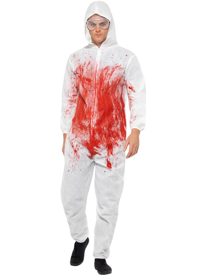 Men's Bloody Forensic Overall Costume, Red, with Goggles & Jumpsuit.