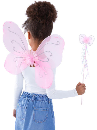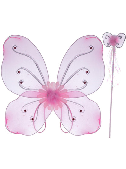 The Pink Butterfly Wings and Wand are perfect for girls. The cute accessories come with flower and glitter trim.