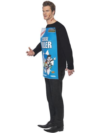Cause a fright with the Cereal Killer Costume. This male comedy Halloween fancy dress costume includes a tabard with print design.