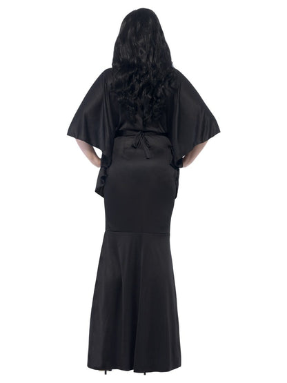 Smiffys latest range of Curves costume's includes this amazing Vamp Costume. This elegant piece comes as a black, full length, fish tail style dress that includes a slit down the front of the skirt and has an attached, loose fitting cape. It has a velvet feel material down the front of the dress with bunched detailing around the bust. Why not have a look through our huge accessories range to add in some make up or a wig of your choice. Wig, heels and choker not included.