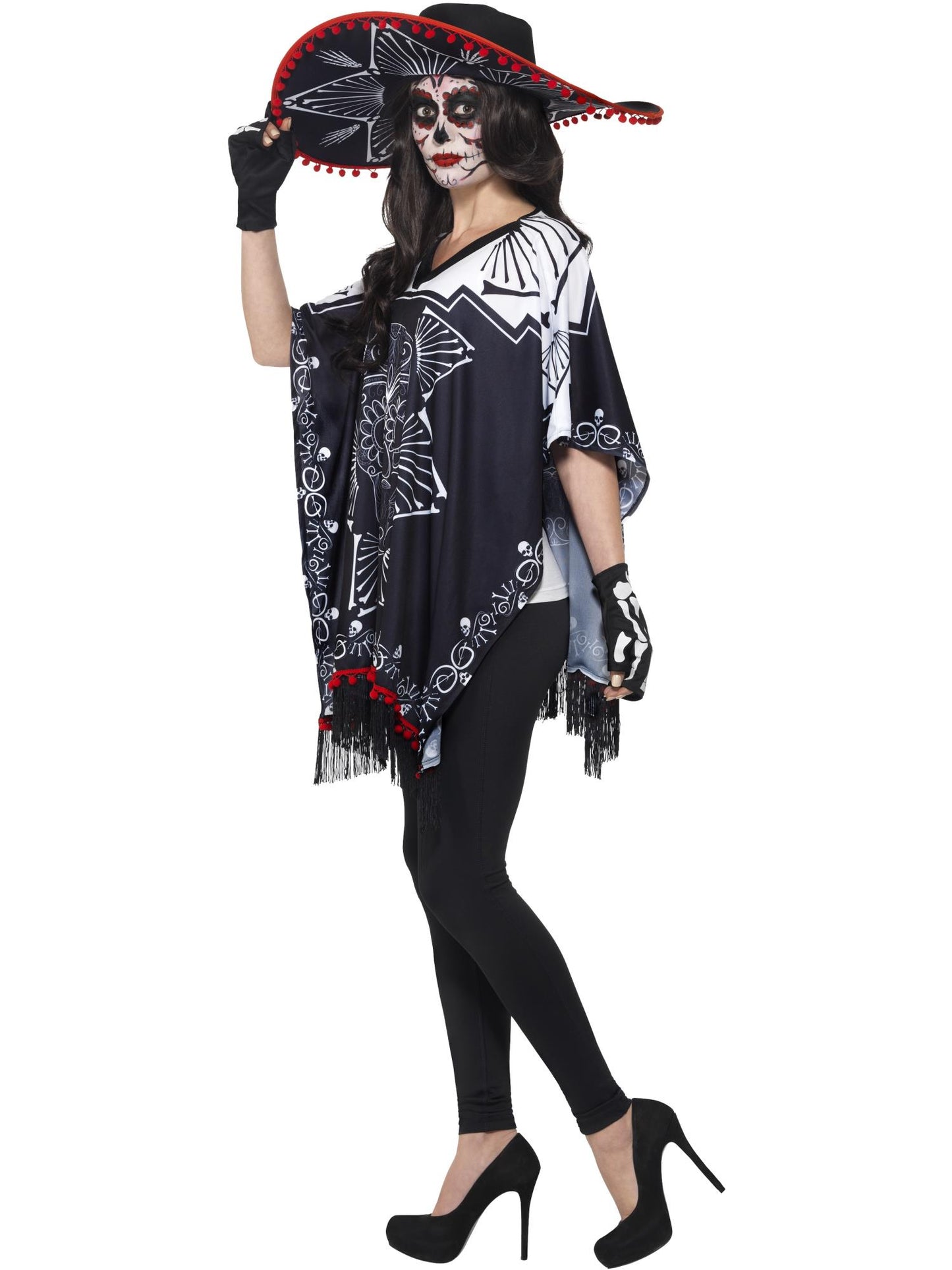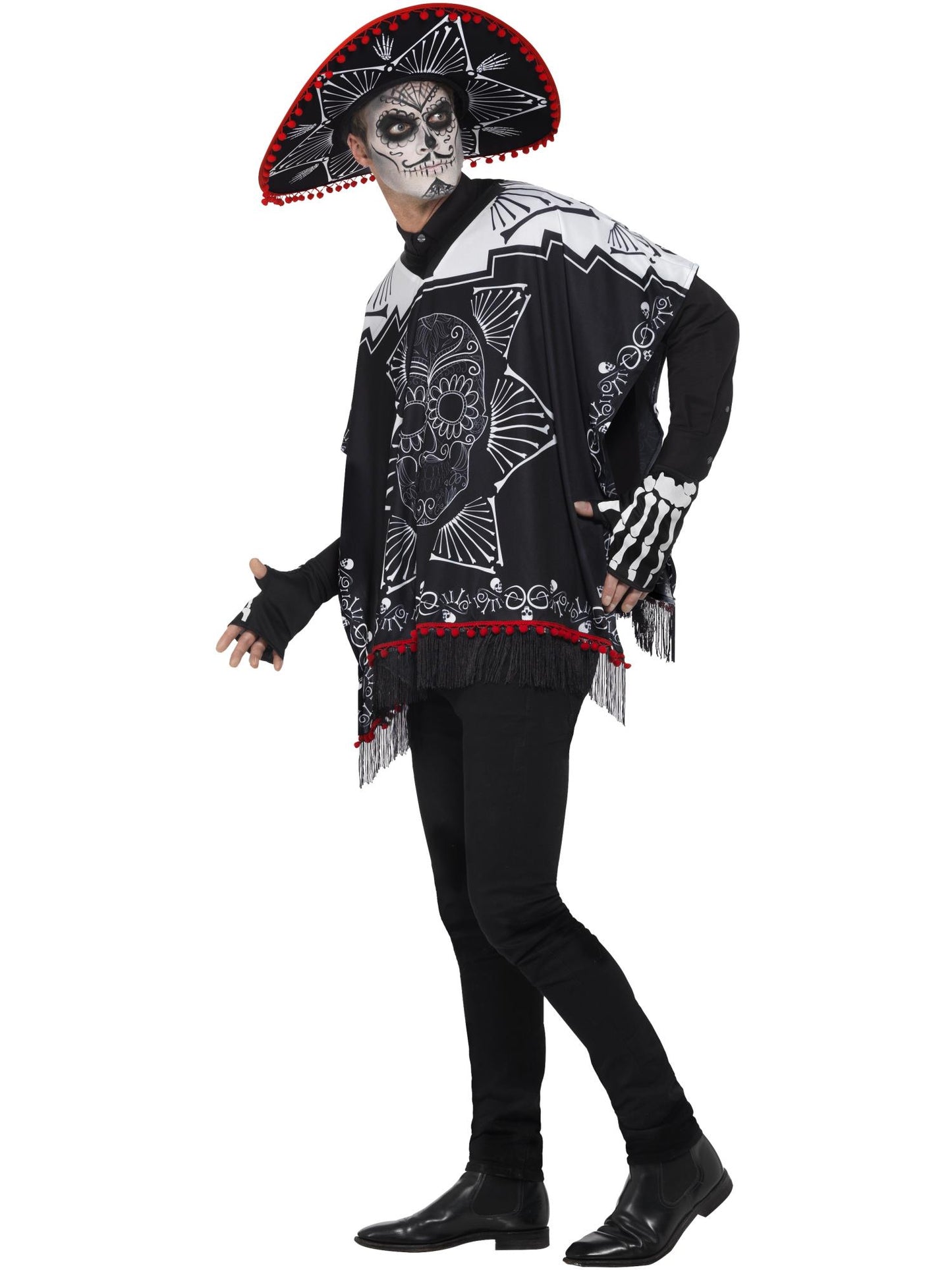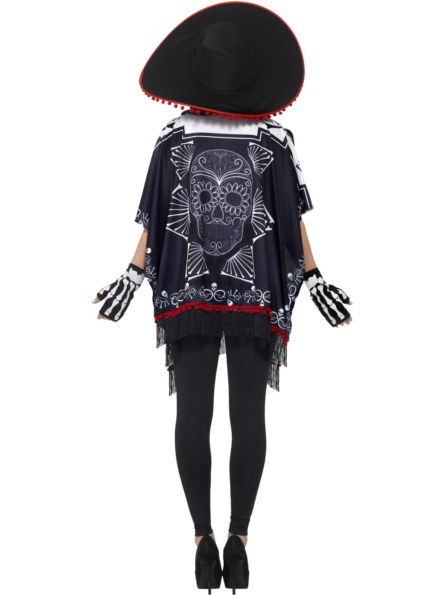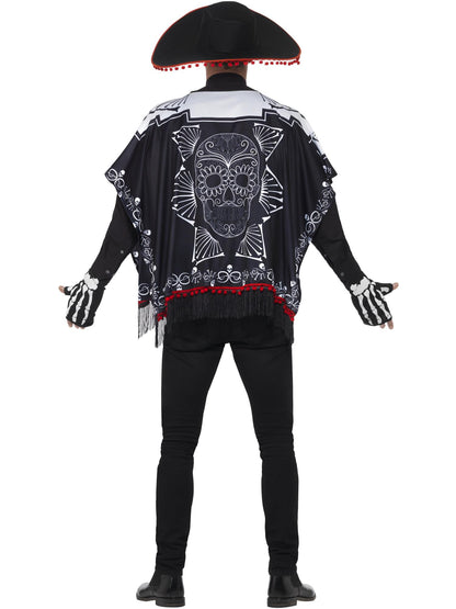 Day of the Dead Bandit Costume, Black & White, with Poncho, Sombrero & Gloves