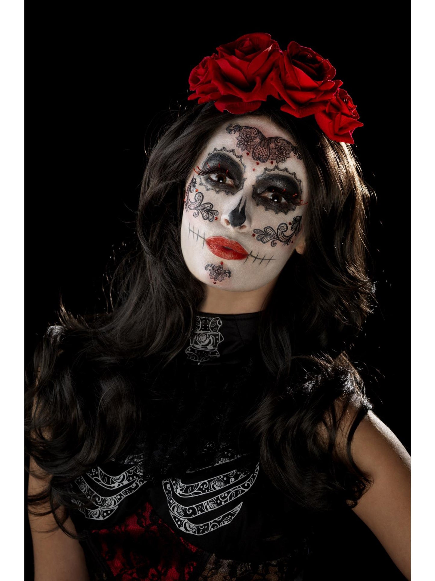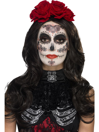 This Day of the Dead Glamour Make-Up Kit is perfect for adding the finishing touches to your glamourous Day of the Dead Costume. This kit includes black transfers, face paint, eye lashes, jewels, and an applicator.