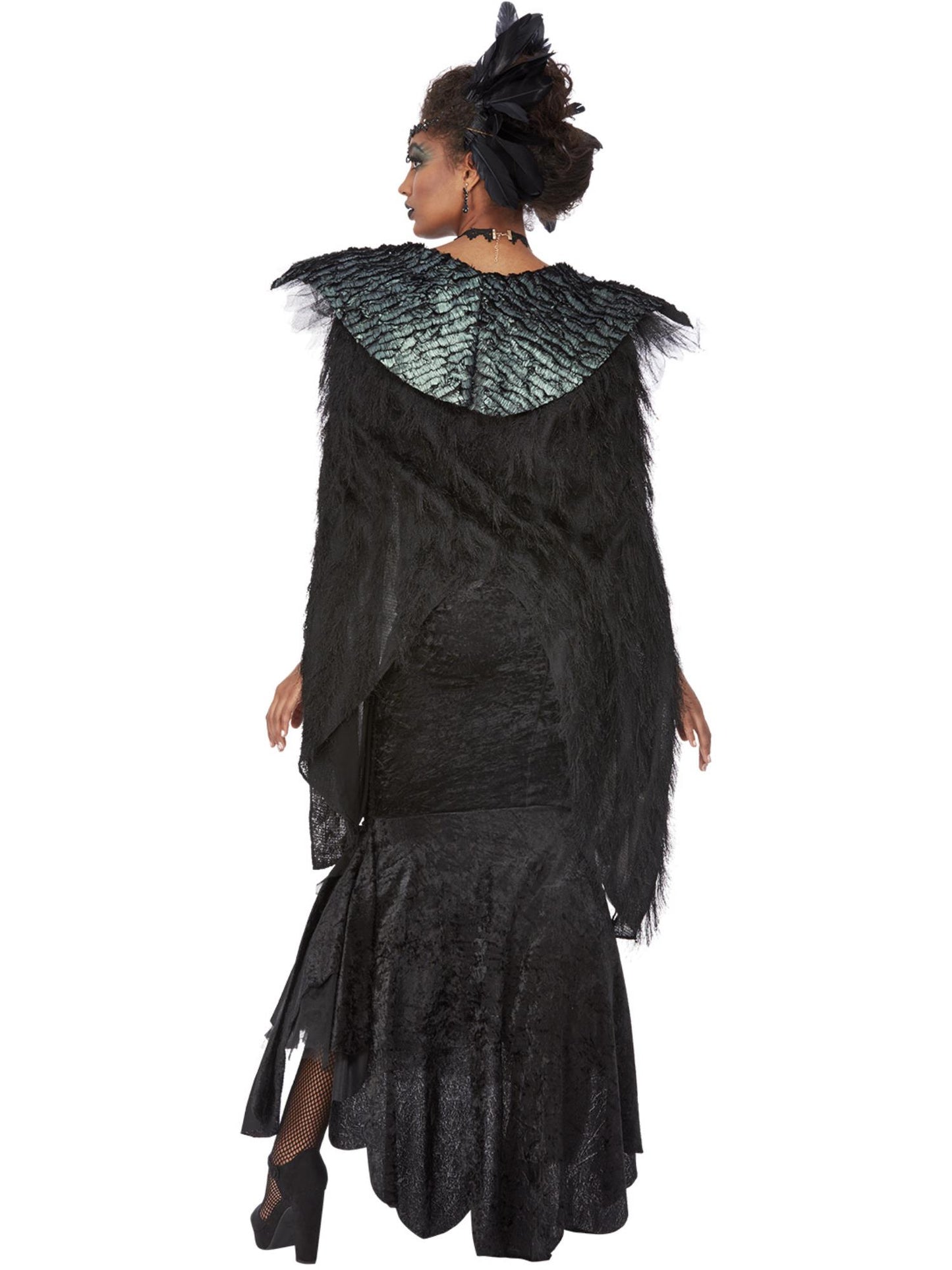 Fans of Maleficent, Dungeons and Dragons, mystical magic, and all things fantasy will love this Raven Queen costume that instantly creates a fabulously feathered and decadently dark character image. The outfit includes a long black dress, cape, and feathered headdress. The V-necked dress has a shiny green design around the neckline and on the bodice, long sleeves in a sheer black fabric that drape from the elbow, dramatic shoulder pads that demand attention, and a fishtail-style hemline with ruffles of black fabric that are longer at the back, allowing just the ankles to be seen from the front. (Shoes not included). The gauzy and feathery-effect black cape that floats down from the shoulders adds to the raven-like look, and the eye-catching black feathered headdress adds the perfect finishing flourish!