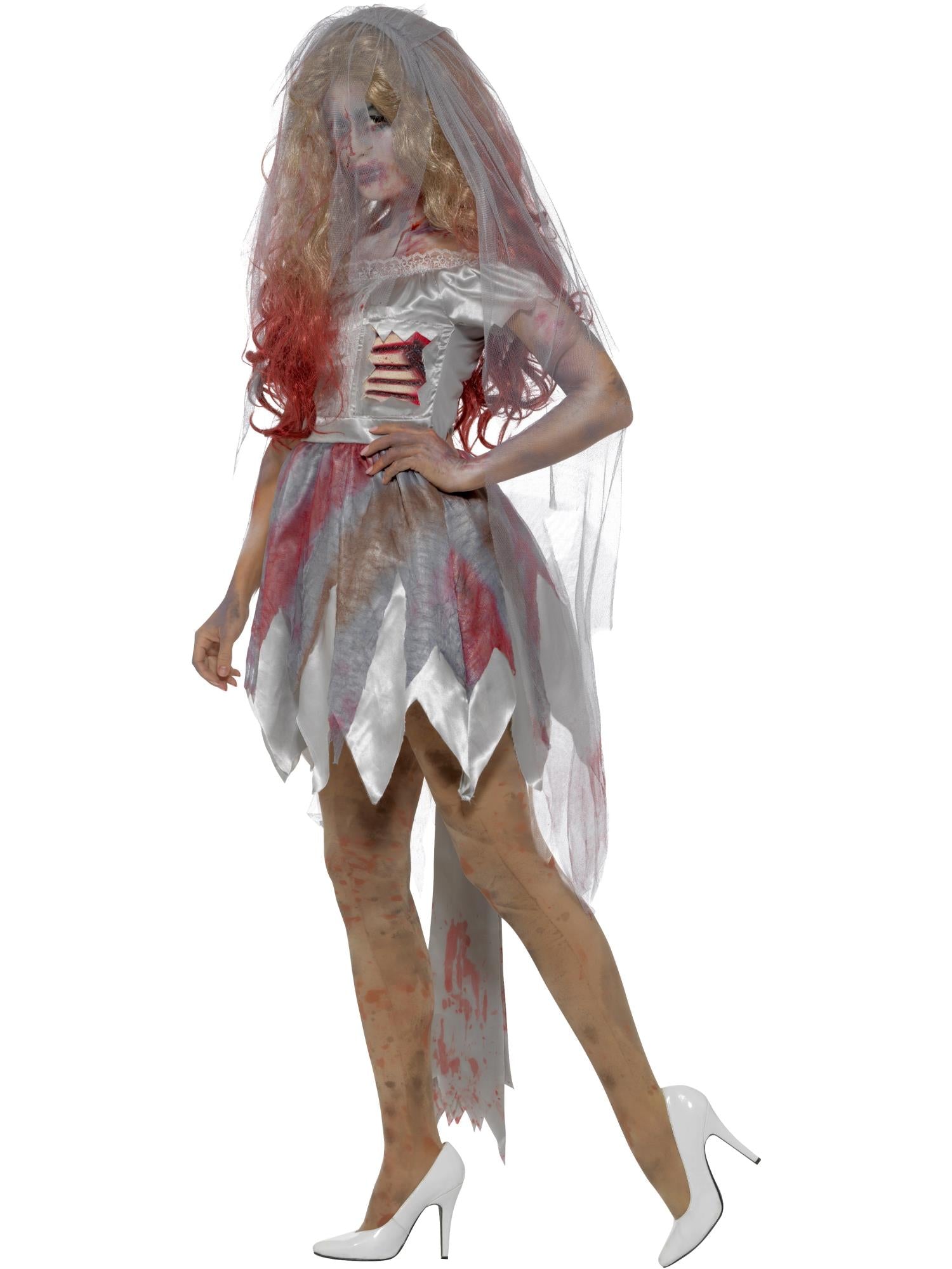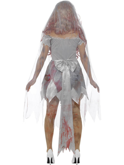 Women's Deluxe Zombie Bride Costume, Grey, with Dress, Attached Latex Rib Wound, Veil & Bouquet.