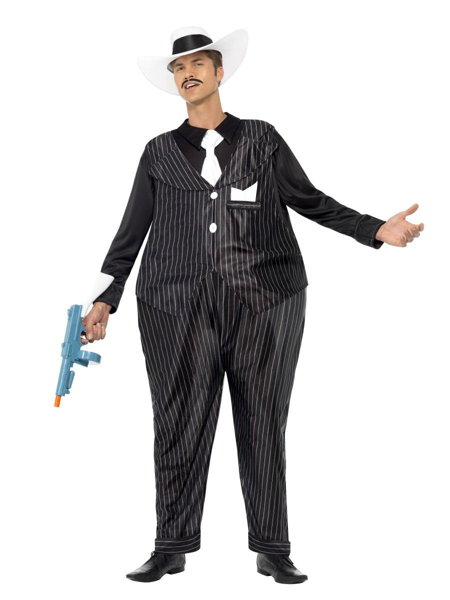 I'm gonna make him an offer he won't refuse. Okay? if you want to act like a gangster first you have to dress like one and this 1920's men's gangster fat cat fancy dress costume gives the perfect impression. The fat cat costume is a black and white pinstriped jumpsuit with a hooped waistband for the fat person effect. It also comes with a white tie and white hat with a black band.