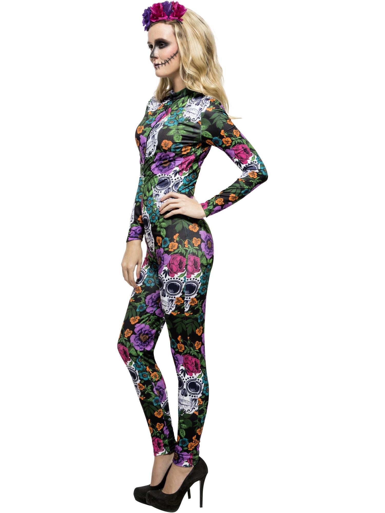 Fever Day of the Dead Costume, Multi-Coloured, with Catsuit & Rose Headband.