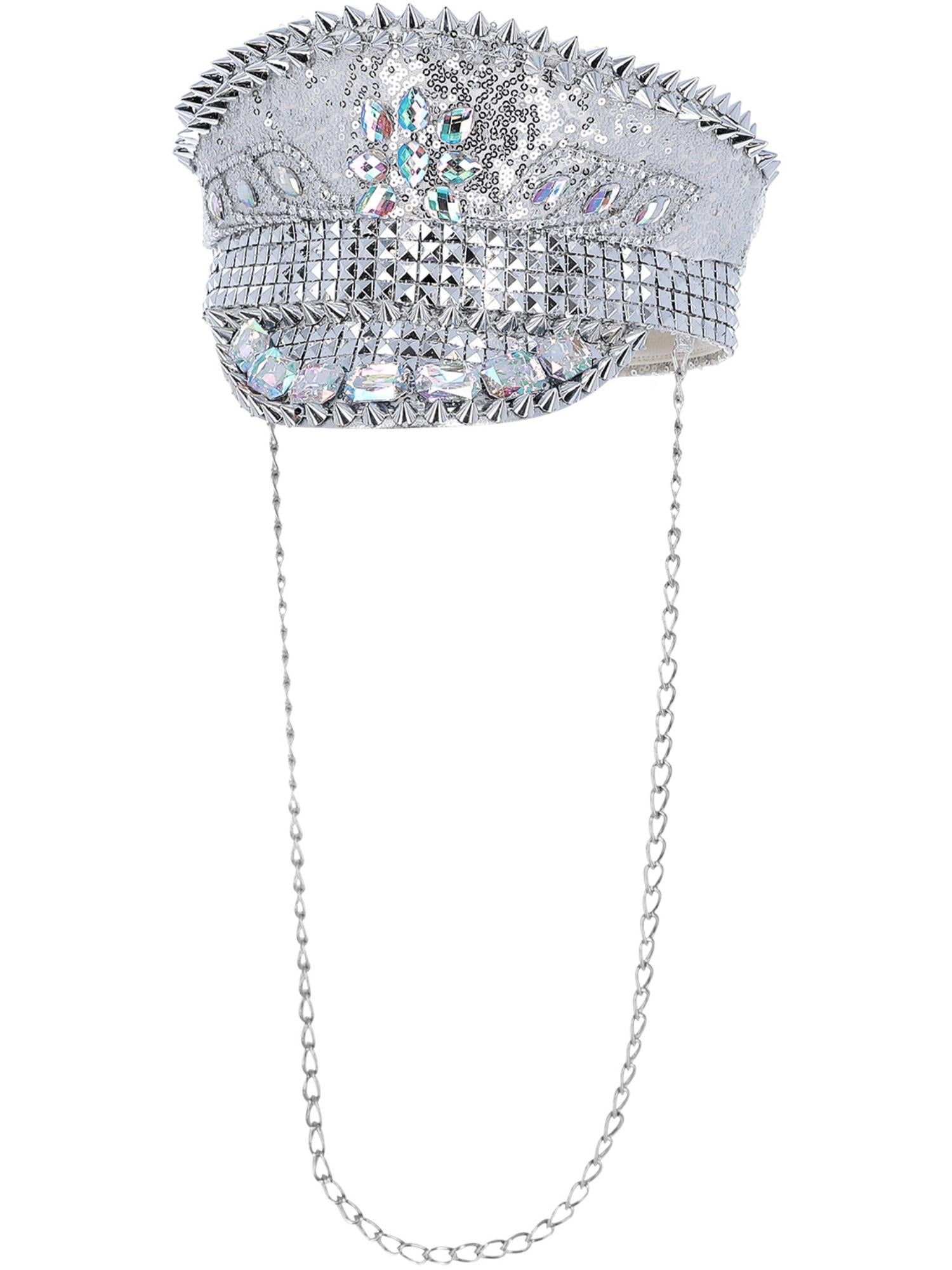Fever Deluxe Sequin Studded Captains Hat, Silver, with Chain