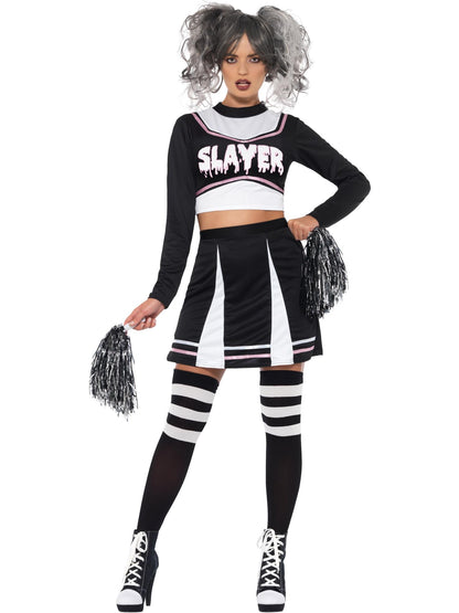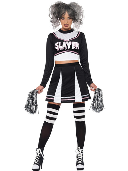 Fever Gothic Cheerleader Costume, Black, with Crop Top, Skirt & Pom Poms.