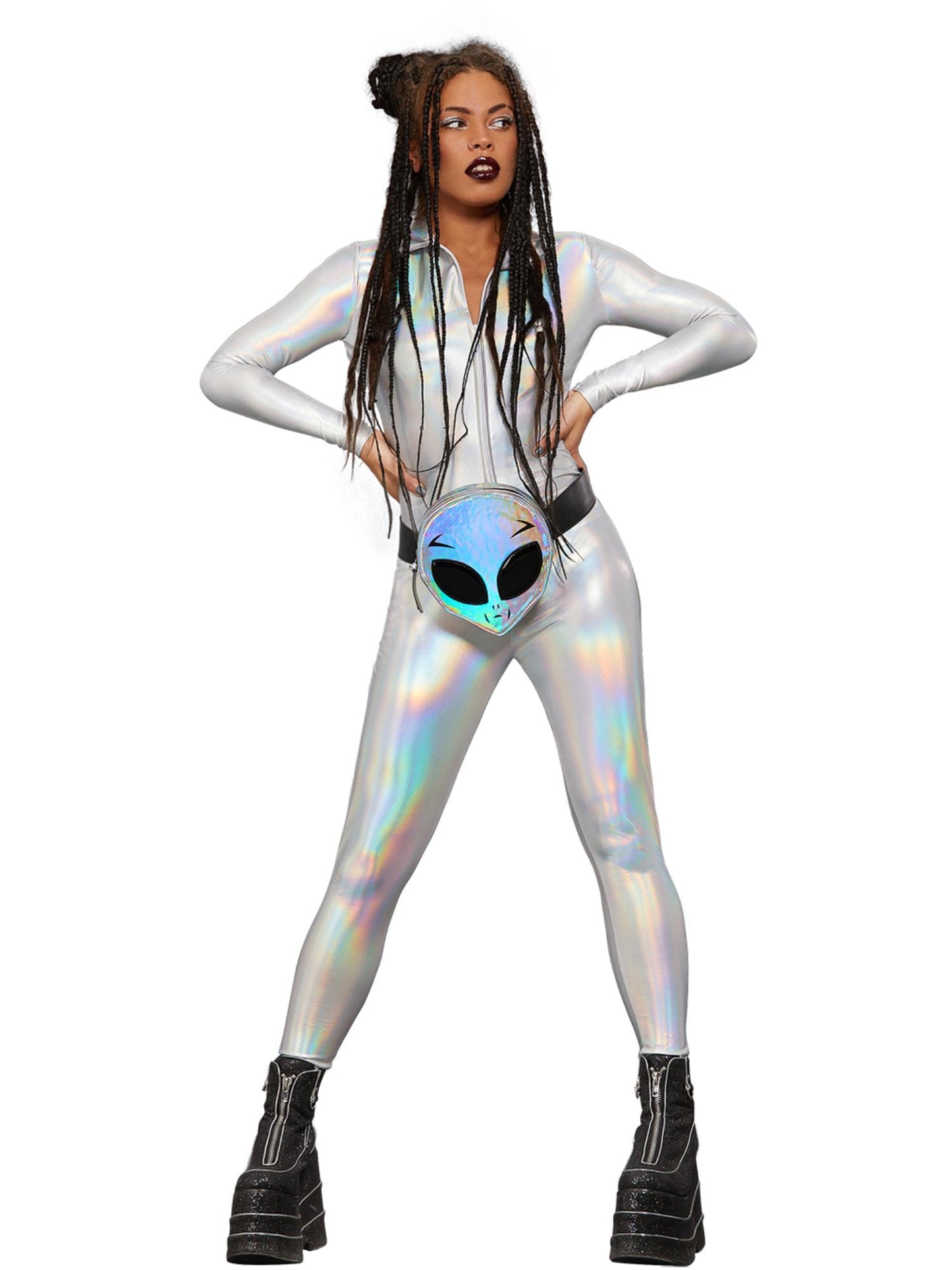 Fever Miss Whiplash Mirror Holographic Costume, Zip Up Catsuit