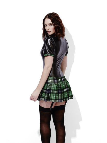 Fever Role-Play Schoolgirl Wet Look Costume, Black, with Dress, Detachable Suspenders & Tie
