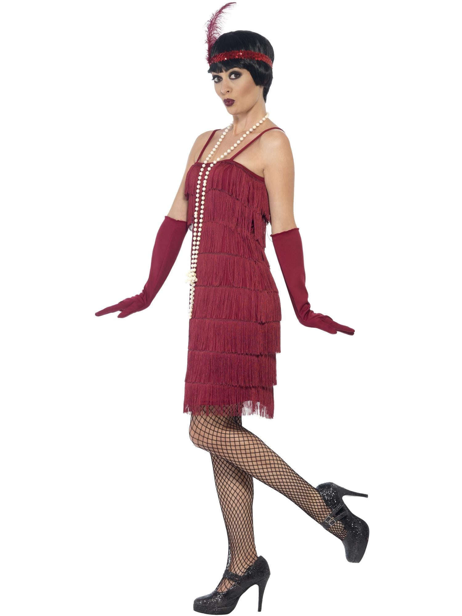 This Short Burgundy Red Women's Flapper Costume is perfect for fancy dress parties and events with a roaring 1920s theme. The costume includes the dress, headband and gloves. Simply finish this look with accessories such as our fishnet tights.
