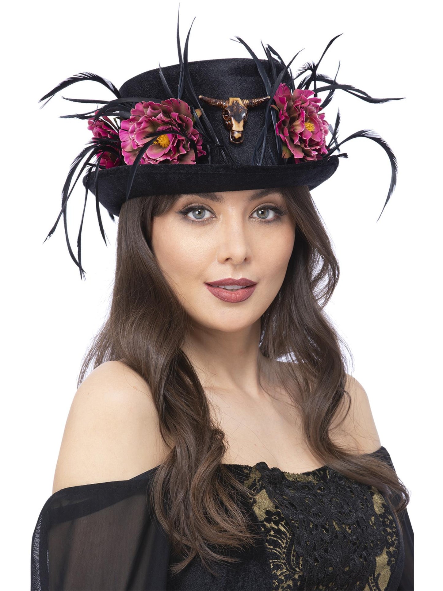 Floral Horn Top Hat, with Pink Peony Flowers & Feathers