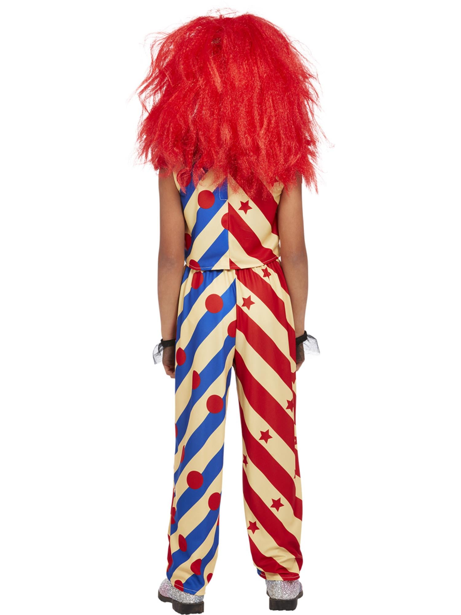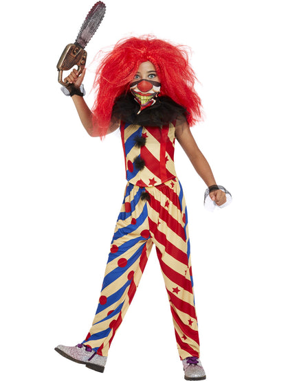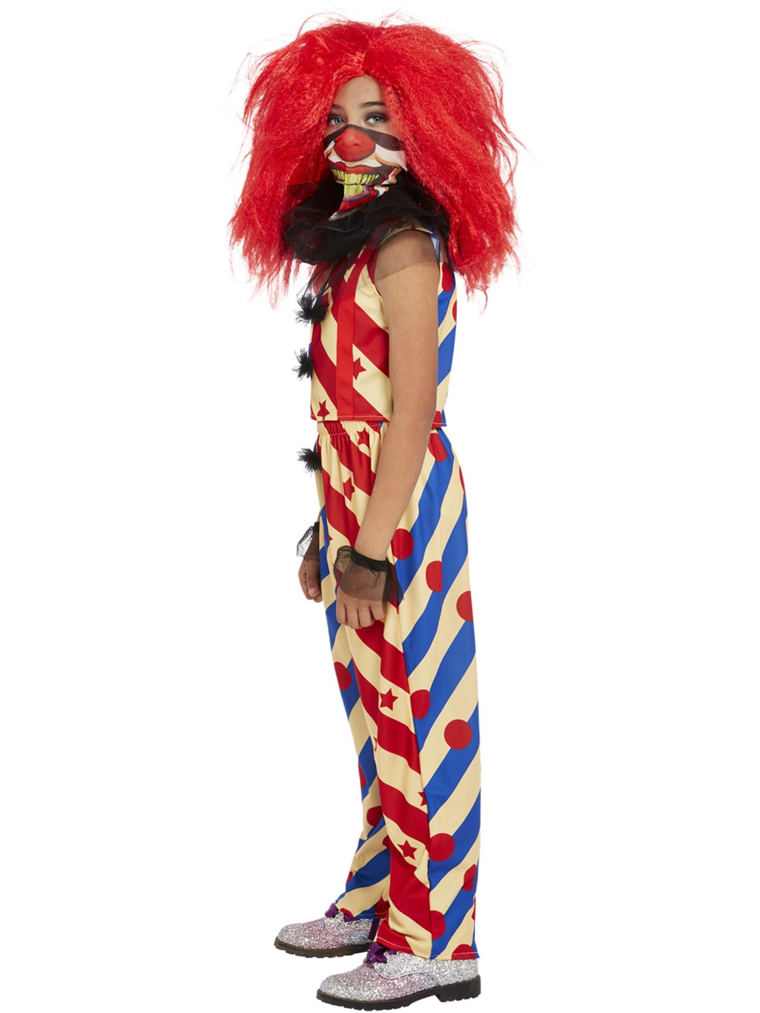 Girls Creepy Clown Costume, with Top, Trousers, Mask, and Ruffles.