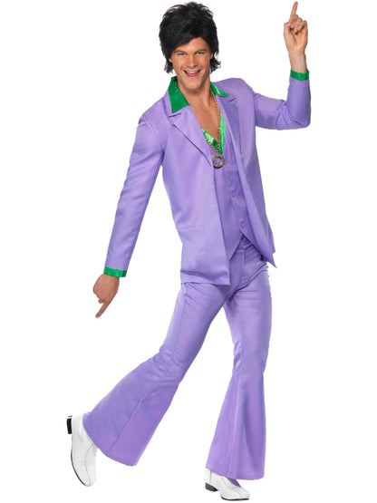 Embrace the disco diva inside with the Lavender 1970'S Suit Costume. This male 70s fancy dress costume will have you throwing shapes all over the dance floor! Trousers, jacket with mock shirt and waistcoat are included.