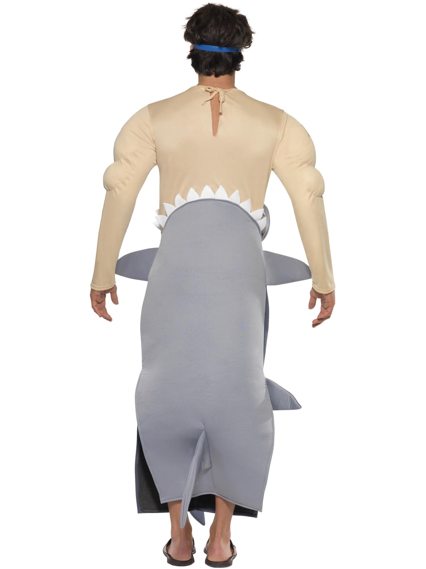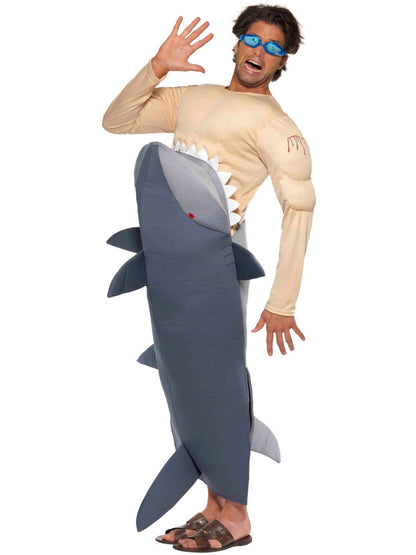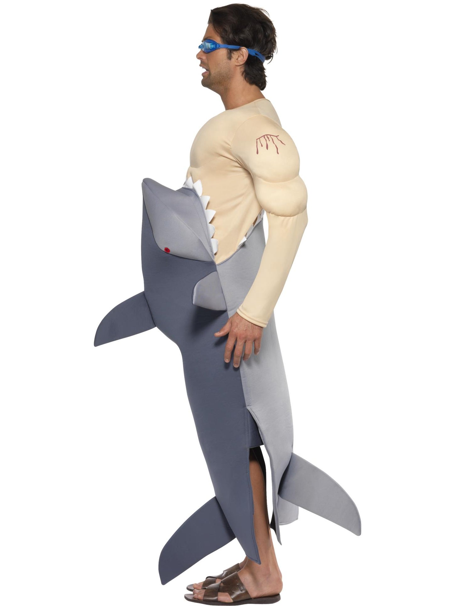 Stand out at the party with the Man Eating Shark Costume. This male comedy fancy dress costume includes a shark bodysuit and goggles.
