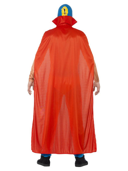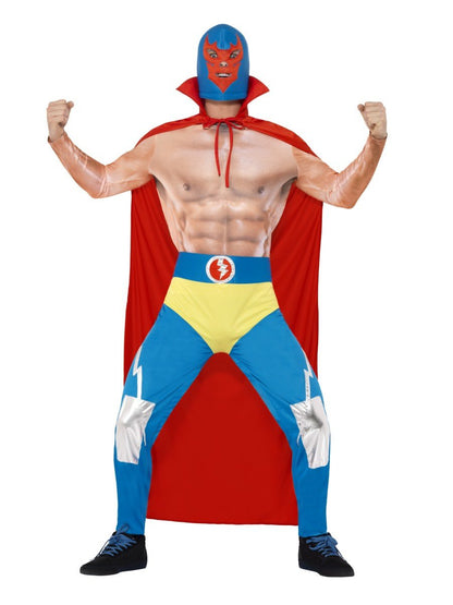 Mexican Wrestler Costume comes with a pair of blue tight fit leggings with an attached pair of yellow underpants and lightening bolts, a red cape that ties around the neck and a blue and red full over the head mask. Don't forget to add our Realistic Muscle Top to complete the look.