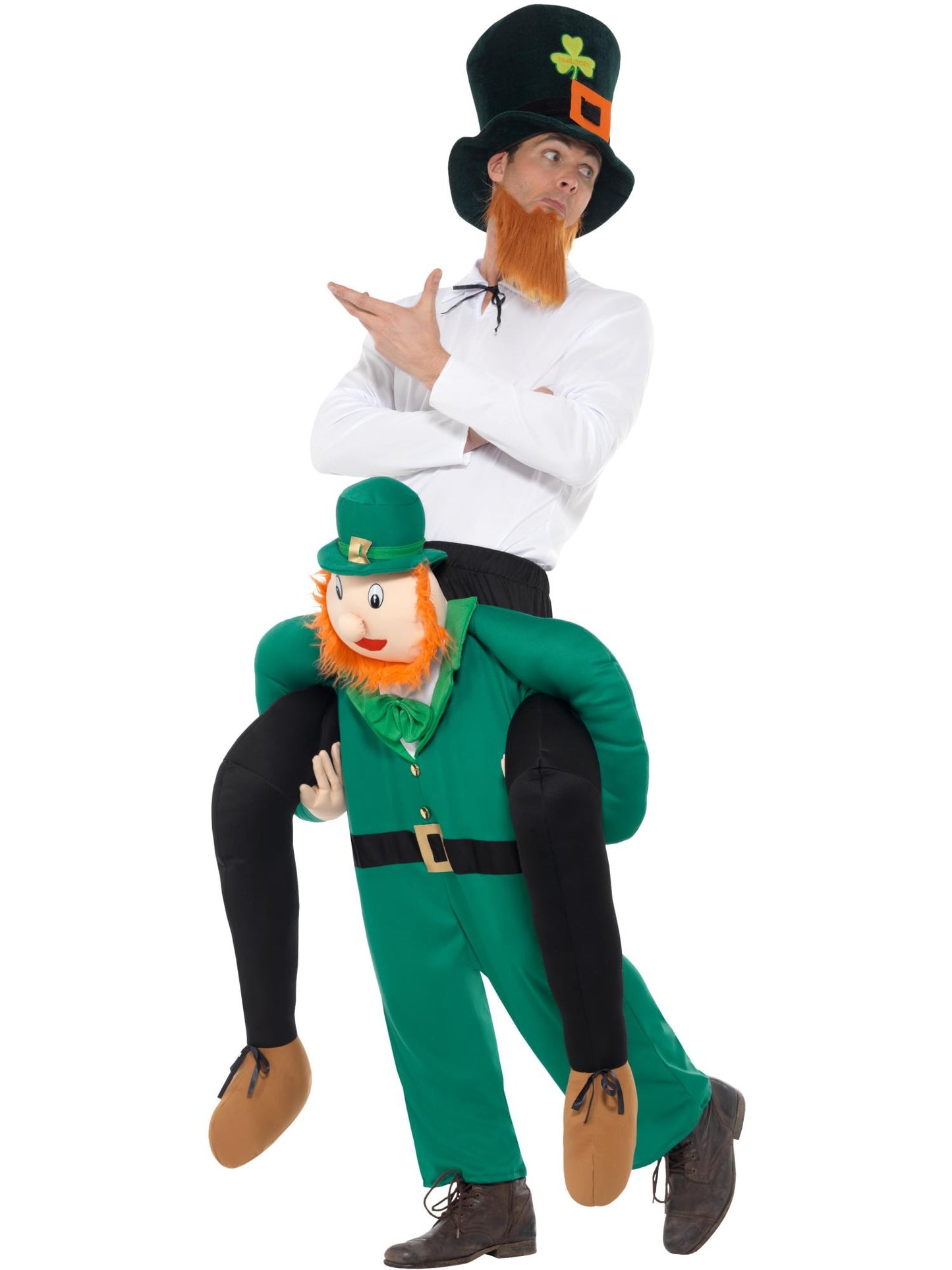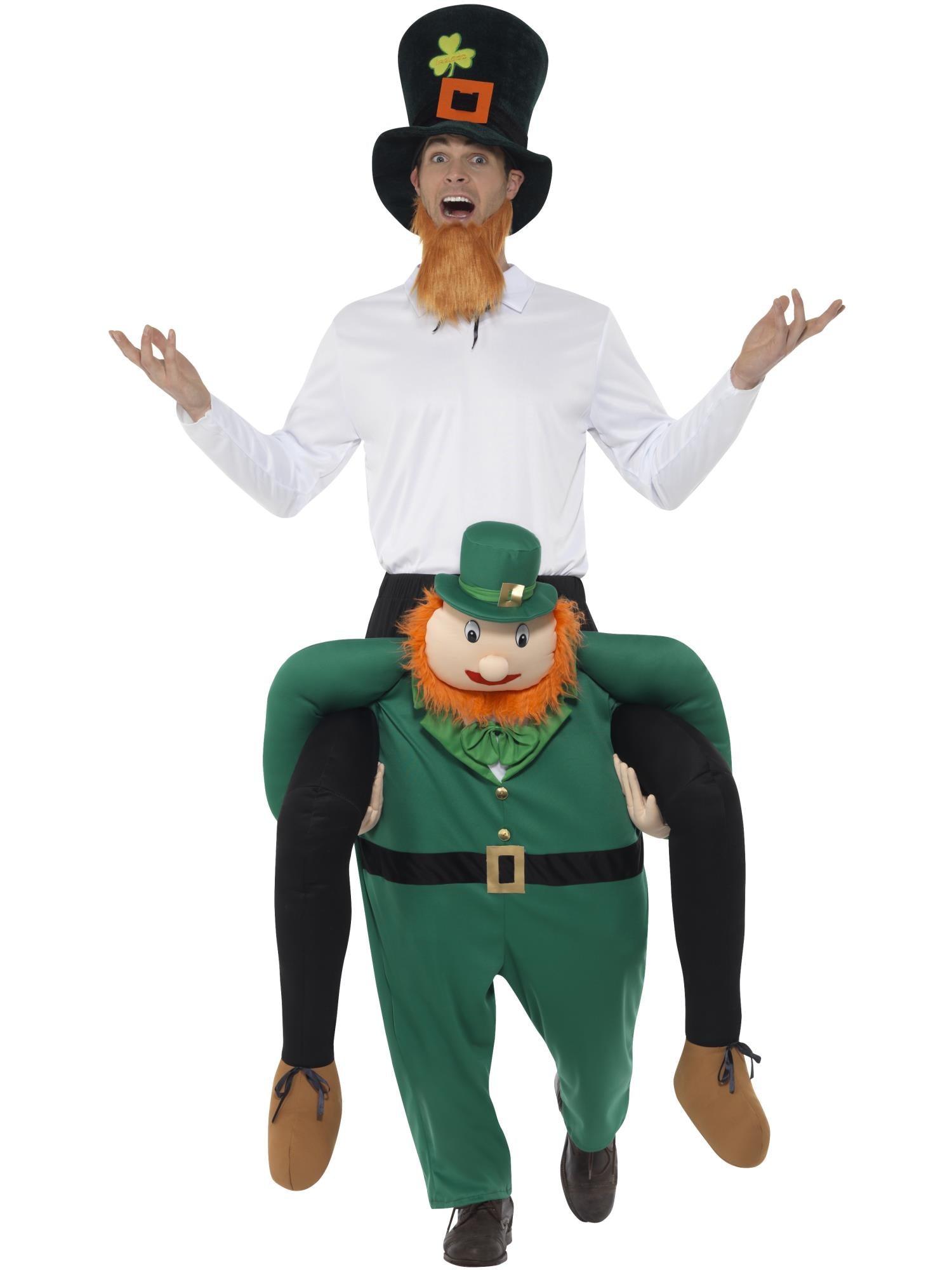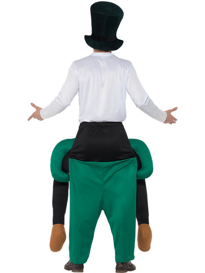 In this Piggyback Paddy's Leprechaun Costume, you're sure to grab some attention! Designed to create the impression of riding piggyback on a leprechaun's shoulders, you're guaranteed to raise a smile wherever you go in this cracker of an outfit! The pull-on trousers give you the fully dressed leprechaun, complete with 3D head and hat, and mock legs that give you the appearance of riding on his back. With his emerald green outfit, faux belt with big shiny buckle, big bow tie, cheeky leprechaun face with chubby cheeks and fuzzy orange beard, and iconic green top hat, what's not to love about this mischievous character! Adding to the ride-on effect, 3D arms wrap around the mock legs that are dressed in dark trousers with tan shoes. What you choose to wear on your top half is up to you, but your leprechaun 'taxi' is sure to steal the show! For some added St Patrick's Day craic, why not accessorise with our (available separately) leprechaun top hat and ginger beard attachment? (Shirt and shoes not included).