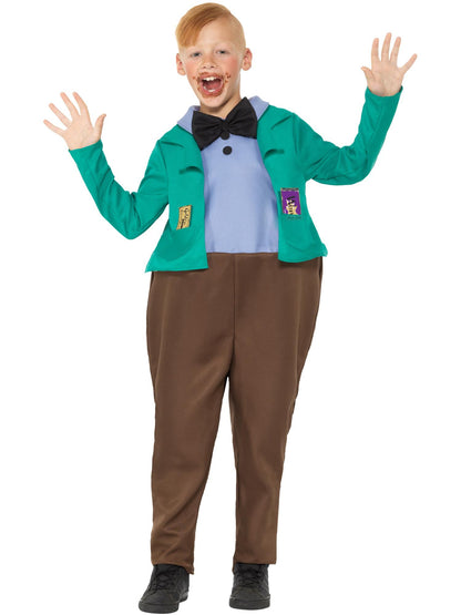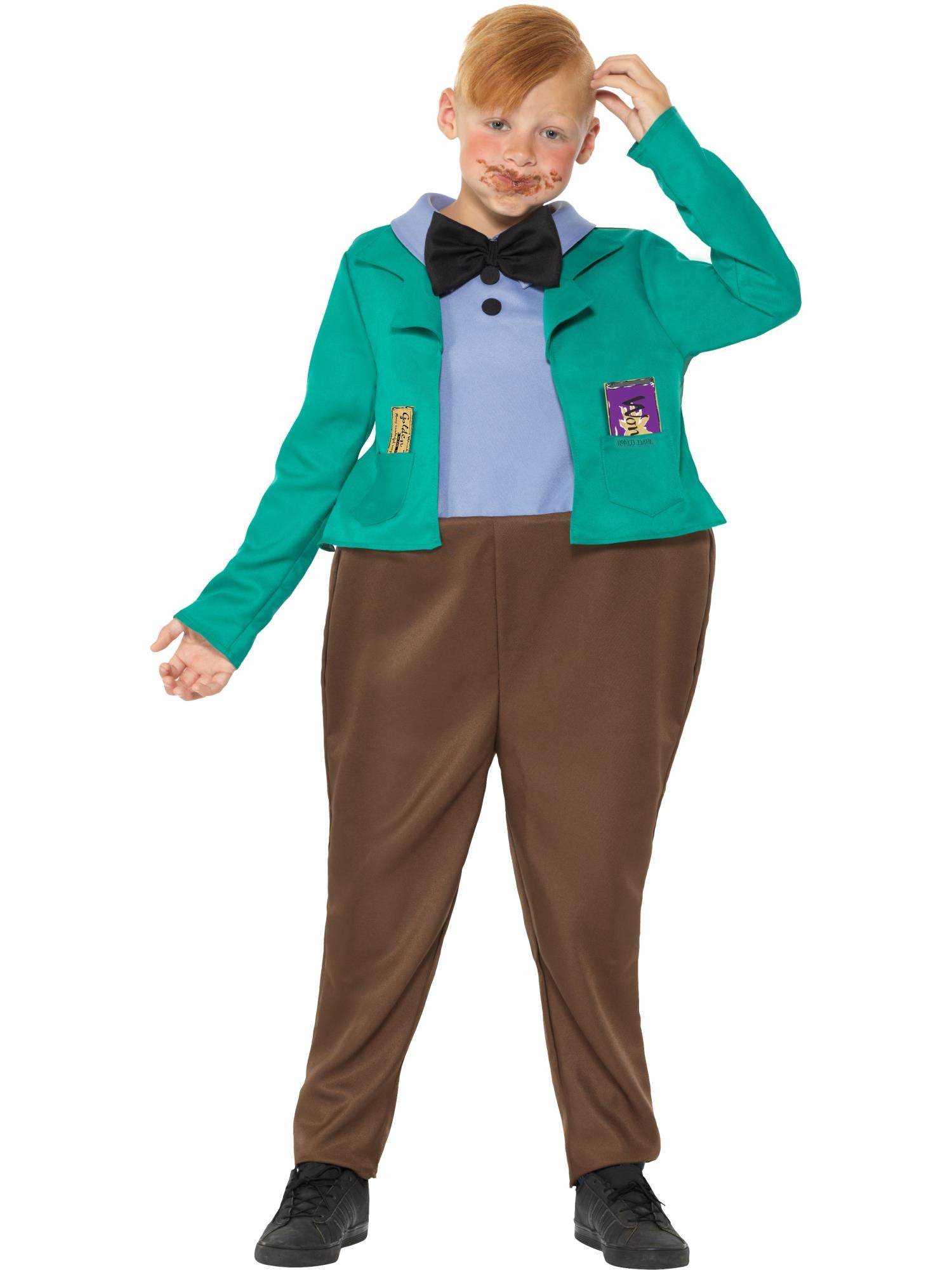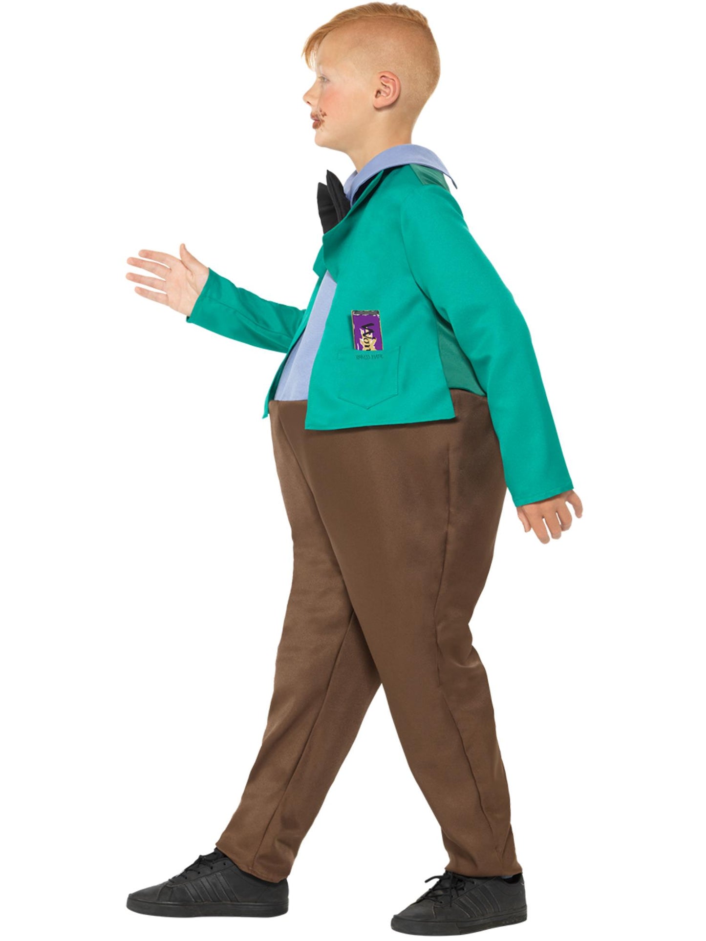 Get ready to take your very own trip around Willy Wonka's Chocolate Factory when you wear an Augustus Gloop costume from our officially licensed Roald Dahl costume collection. Brilliant for World Book Day or Roald Dahl Day, our Augustus Gloop Costume contains Green and Blue Top with attached Bow Tie, and Brown Trousers to complete the look. Also included is a Golden Ticket & Chocolate to put in the Jacket Pockets. Just make sure you stay away from the Chocolate River!.