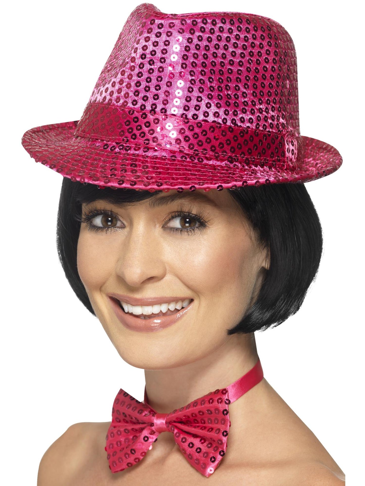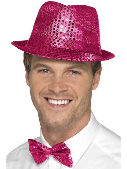 Both men and women can dazzle in the pink sequined trilby hat. Available in one size only, this accessory is sure to get you noticed at the party.