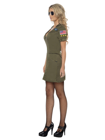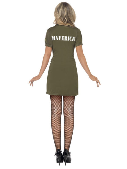 Aim for the Sky in our Sexy Top Gun Costume at your next 80's or Movie themed event. This Licensed Costume includes a short green dress with a zip-up front and a low-cut neckline. The dress is adorned with a Top Gun badge on the lapel and the American flag and yellow stars on the sleeve. The back of the dress is printed with 'MAVERICK' in a large white font. Don't Forget to add a pair of our Aviator specs to complete your look!