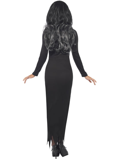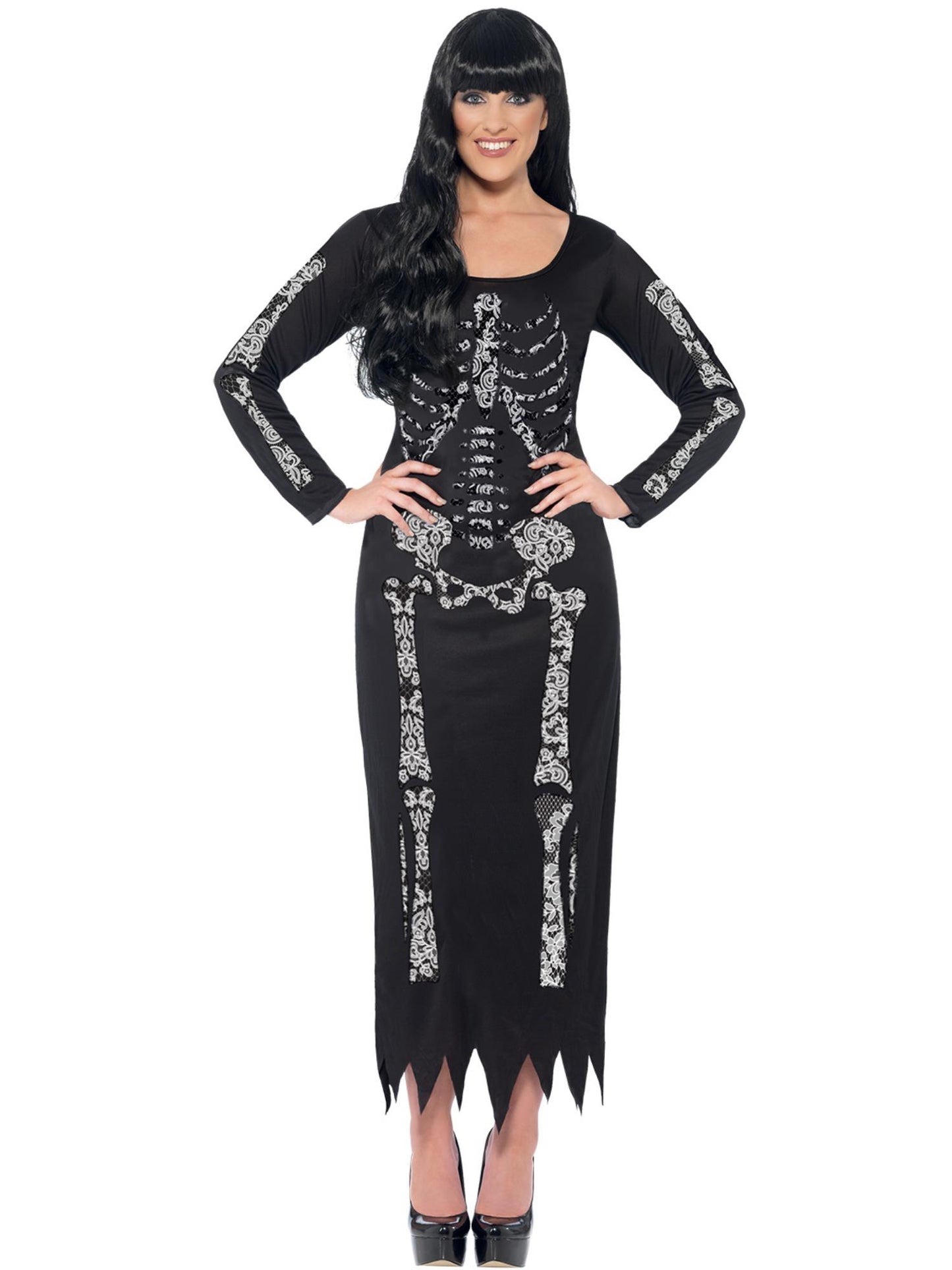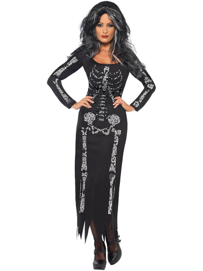 Ladies, shake your bones in the Skeleton Costume. This female Halloween fancy dress costume features a long tube dress with long sleeves and skeleton print design. Complete the look with our Silver Siren Wig.