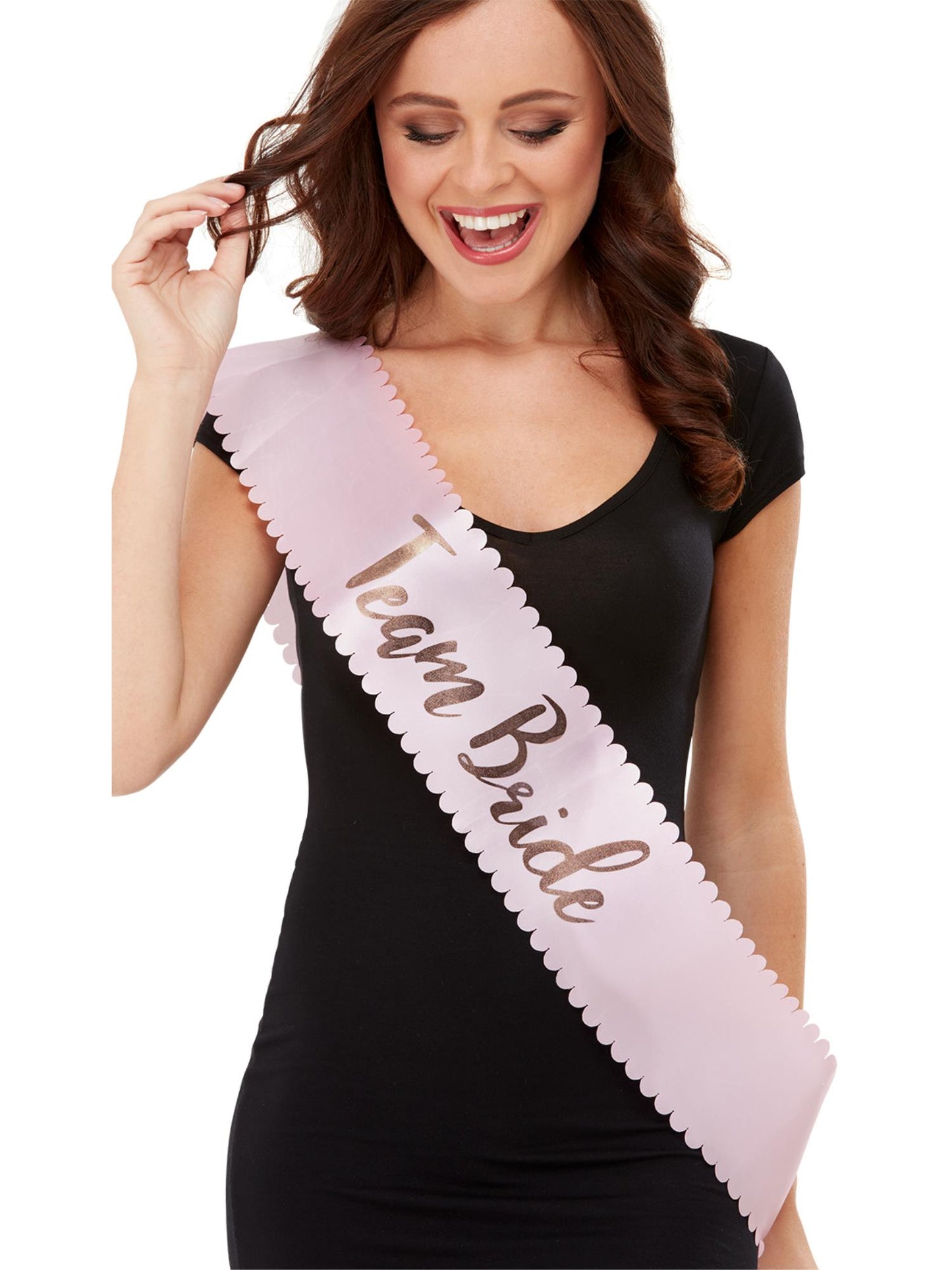 Team Bride Sash, Pink & Gold, with Scalloped Edge.