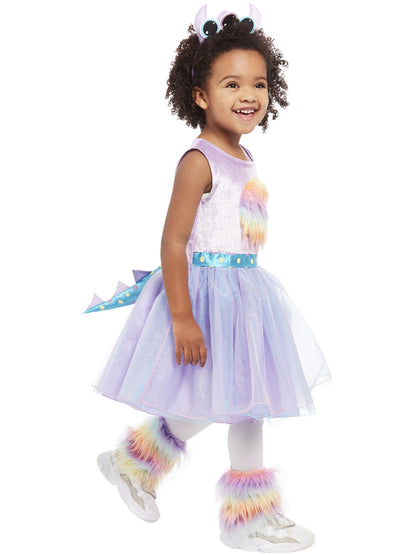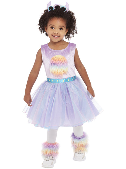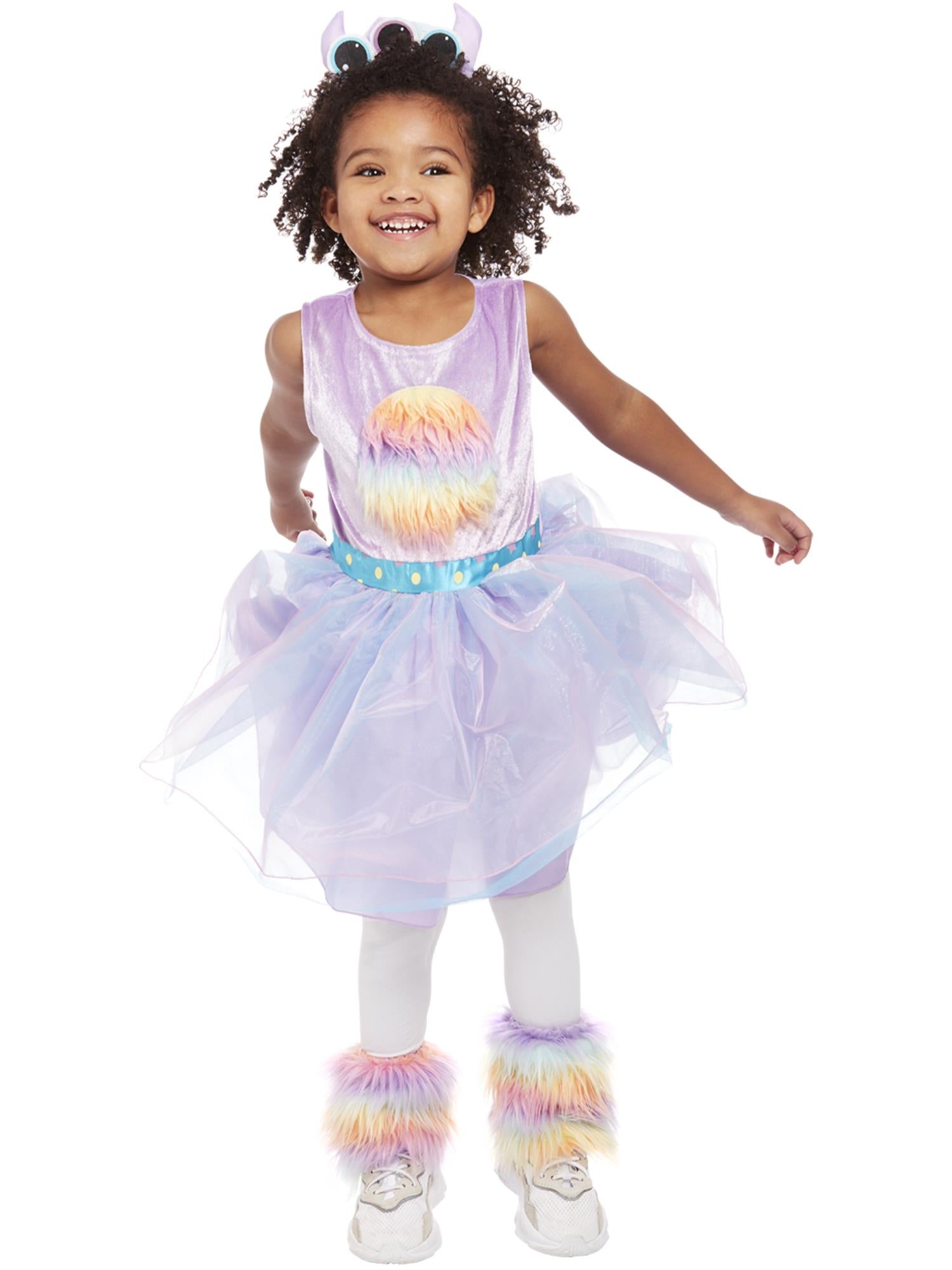 Toddler Cute Monster Costume, Purple, with Dress, Leg Warmers, and Headband.