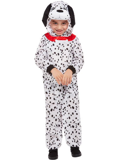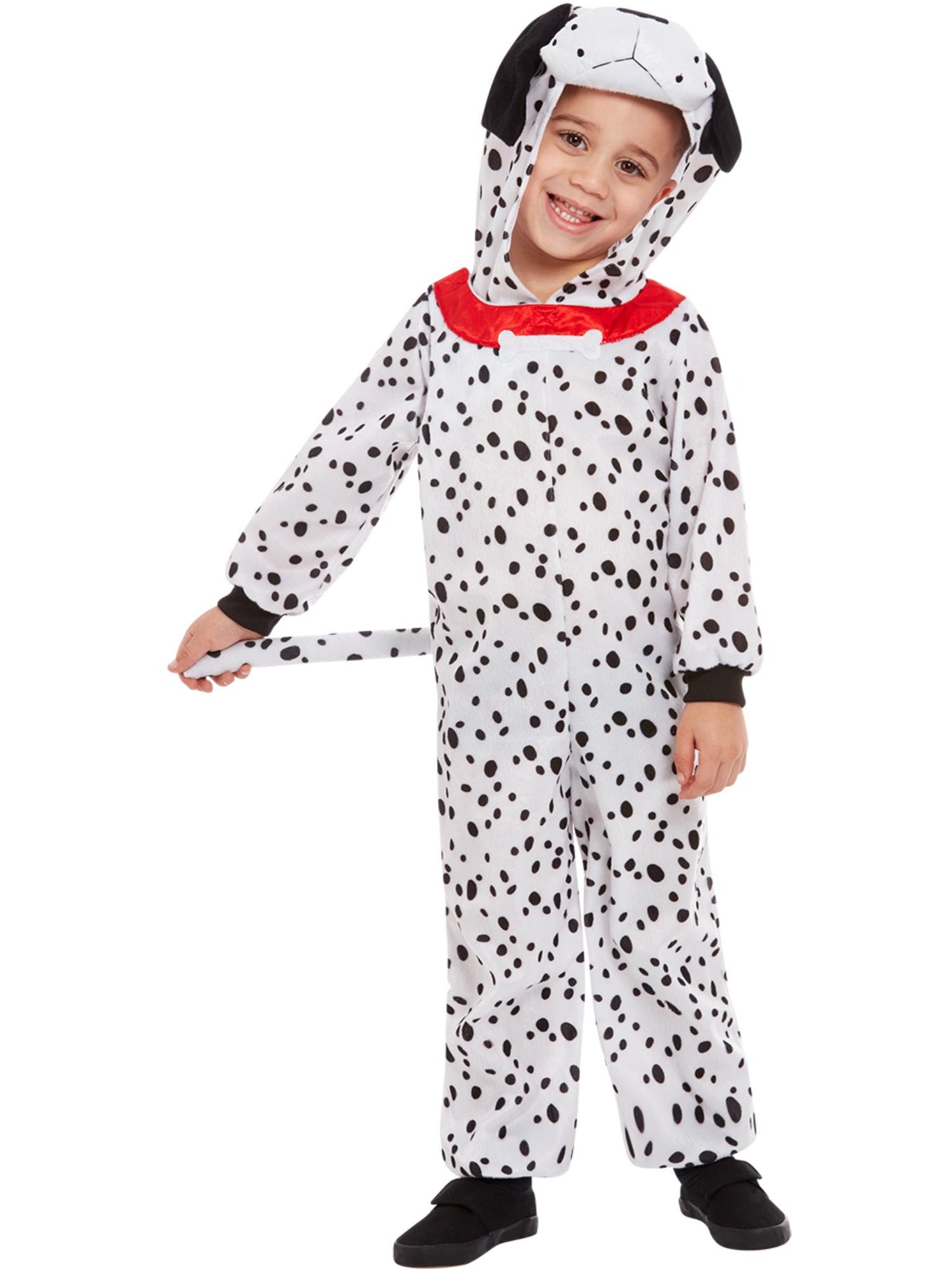 Get ready for a cuteness overload with this toddler Dalmatian costume! Perfect for book day, fancy dress parties, or just dressing up as a dog, you can't help but go dotty for this gorgeous all-in-one outfit that transforms your little one into a spotty dog in an instant. The long-sleeved jumpsuit is beautifully printed with delightful Dalmatian spots, and the attached 3D hood is designed to look like a super-cute puppy face, complete with floppy black ears and puppy-dog eyes. A shiny red collar with a bone-shaped dog tag is stitched around the neckline and adds a dash of colour. The suit fastens at the front with Velcro and has stretchy black cuffs at the wrists and elastic at the ankles. An easy to wear and comfy to play in outfit, this Dalmatian costume is perfect for staying in character all party long. Woof!