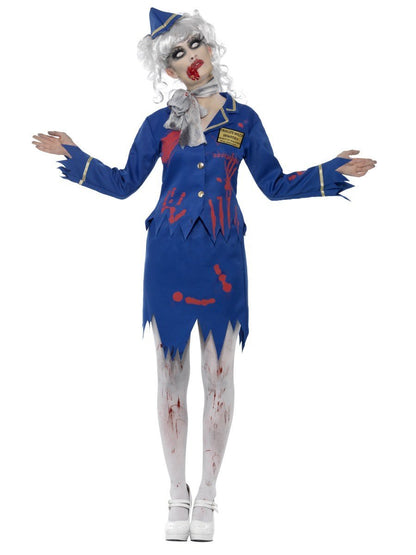Serve up a deadly treat in the ladies Zombie Air Hostess Costume. This Halloween outfit includes a dress, lifejacket and cape. Don't forget Smiffy's Make-Up FX and fake blood to complete the haunting appearance.